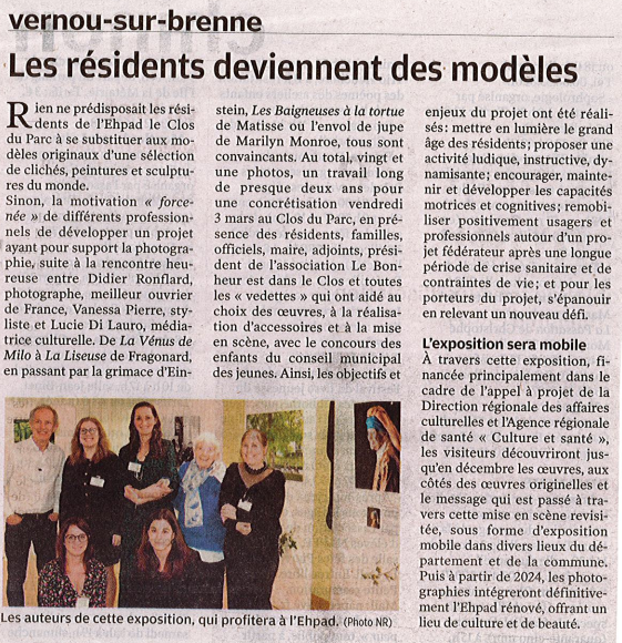 Du 17 au 19 mai, nous avons eu le plaisir de voir l’exposition photo réalisée par l’EHPAD du Clos du Parc dans notre salle des fêtes. Ce projet est l’aboutissement de deux ans de création et de collaboration entre les résidents et l’équipe de l’EHPAD, Didier RONFLARD – photographe et meilleur ouvrier de France, Vanessa PIERRE – créatrice styliste, et Lucie Di LAURO – médiatrice culturelle. L’exposition est constituée de 21 photographies originales, inspirées d’œuvres d’art plus ou moins célèbres. Chacune véhicule divers messages (lutte contre l’âgisme, écologie, intergénérationnalité, égalité, etc). Quatre cents personnes ont pu la voir, s’en inspirer et la commenter, comme Marine : « un regard très touchant sur le grand âge. Des résidents pétillants, plein d’auto-dérision et de tendresse ». Les œuvres se baladent depuis dans les différents commerces de la ville. A terme, l’exposition constituera la décoration définitive des espaces collectifs de l’EHPAD.
