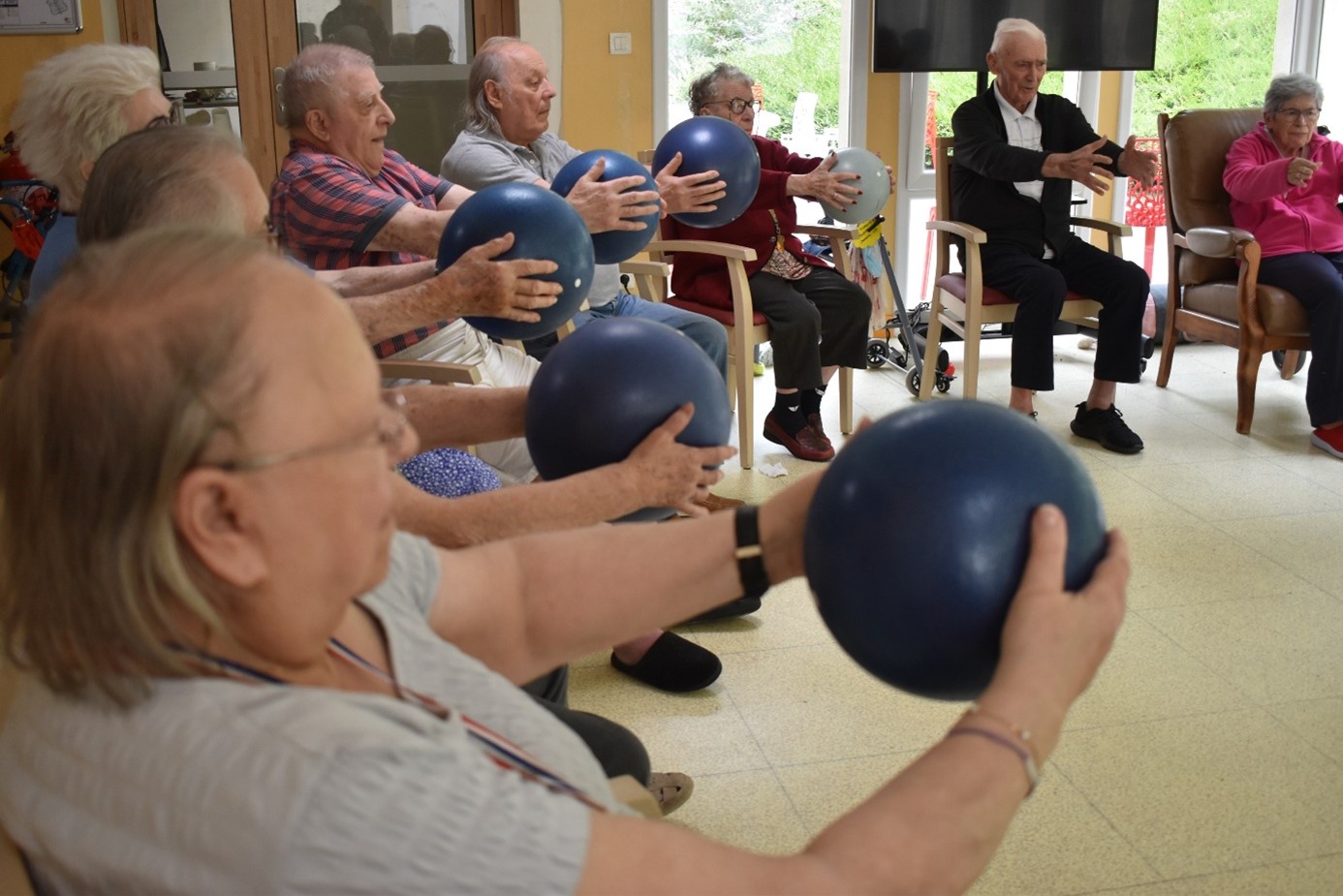 Valentin et Sarah, deux Educateurs Physiques, proposent une à deux fois par mois des activités physiques adaptées, ludiques, en musique et dans la bonne ambiance, très prisées par les résident·es !